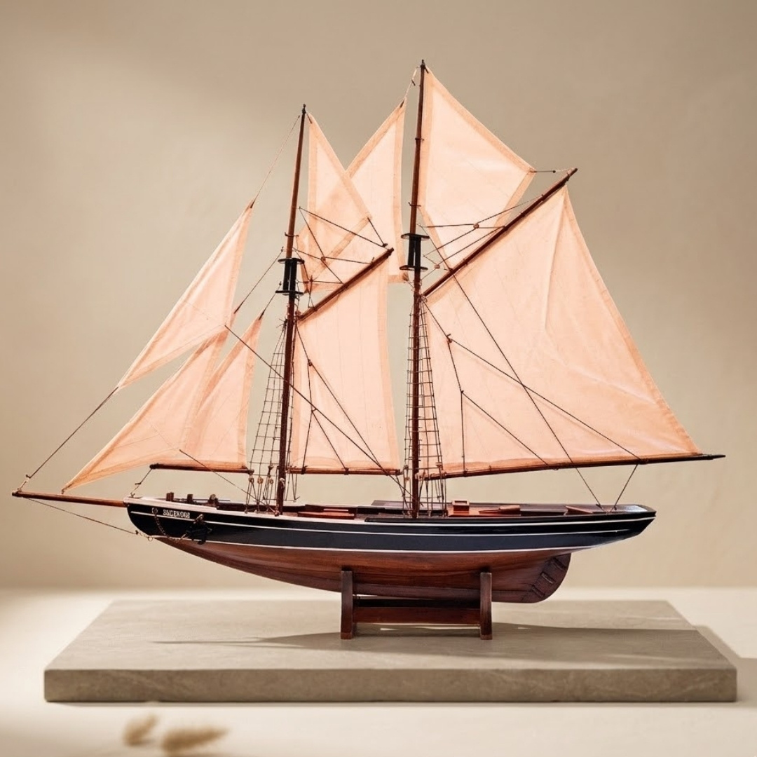 Piękny , duży dwumasztowiec Bluenose z okresu dwudziestolecia międzywojennego. Model jest wysokiej jakości wykonany z drewna z dużą dbałością o szczegóły , żagle z materiału płóciennego. Takielunek do samodzielnego montażu , nie wymaga dodatkowych narzędzi. Wymiary : 78x11,5x66 cm.