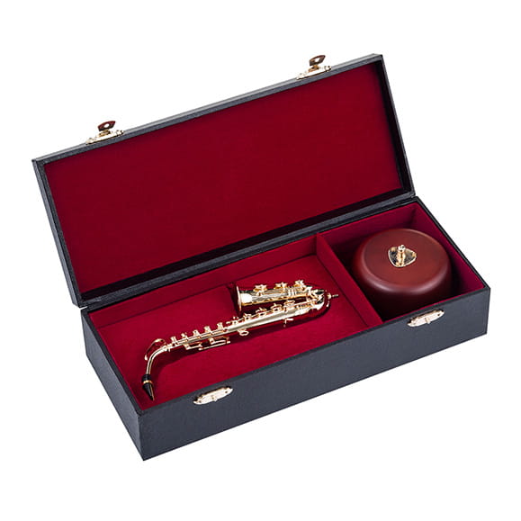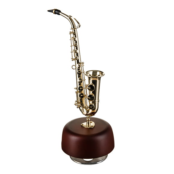 Miniaturka saksofonu wykonana z drewna i metalu o wysokości 20 cm. Wewnątrz podstawy zamontowana nakręcana pozytywka. Precyzyjnie wykonane wszystkie detale instrumentu , w komplecie stojak i elegancki futerał.